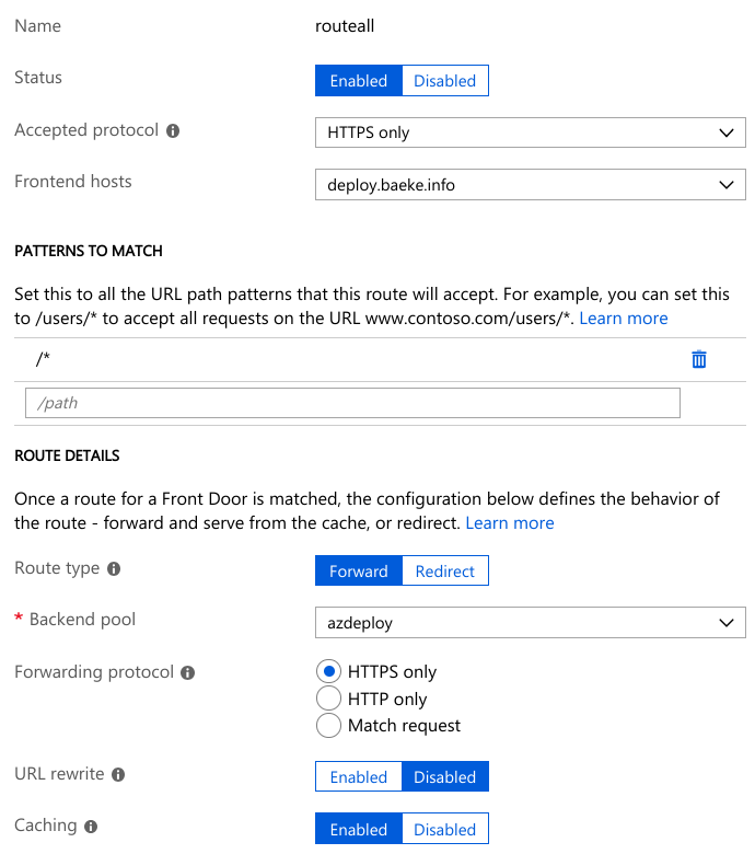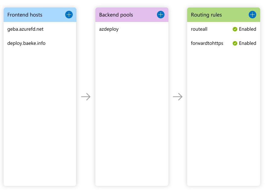 The above configuration exposes a static website hosted in an Azure Storage Acccount (the backend in the backend pool). The custom domain deploy.baeke.info maps to geba.azurefd.net using a CNAME in my CloudFlare hosted domain. The routing rule routeall maps all requests to the backend.