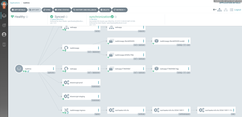 - realtime.yaml: Redis deployment, Redis service (ClusterIP), realtime web app deployment (based on this), realtime web app service (ClusterIP), ingress resource for https://real.baeke.info (record automatically created by externaldns)