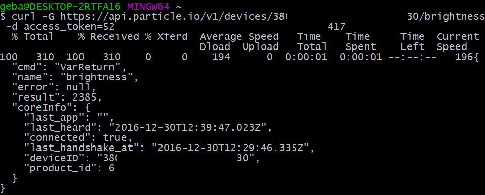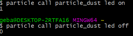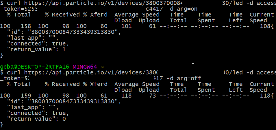 To use the HTTP POST method, there’s a myriad of tools and frameworks to do so. From the command line, you can use cURL but you could also use Postman. I use cURL on Windows, which is part of Git Bash. You can also try https://curl.haxx.se/download.html. With cURLyou need to supply your device ID + an access token you can get from the IDE: