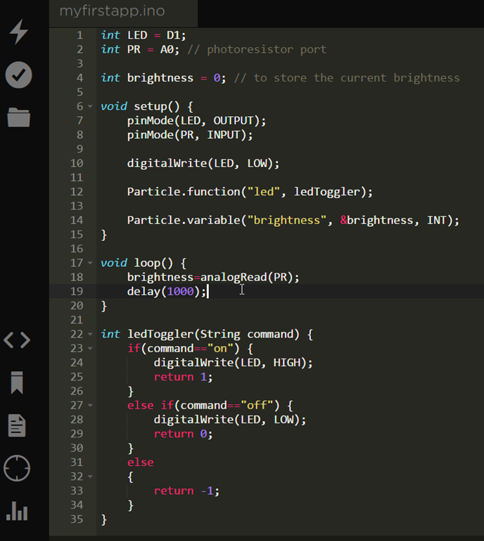 Functions are great to trigger actions on your devices, but how do we read data from a sensor like the photoresistor in our case? That’s surprisingly easy again: just use a Particle Variable. Modify the code as follows: