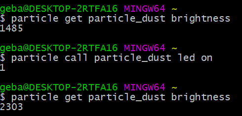 Above, the A0 pin (called PR) is setup for reading values. In the loop, we keep reading the brightness from the photoresistor using analogRead followed by a delay of 1 second. A Particle Variable is defined that you can read from the cloud using the CLI or HTTP GET. With the CLI: