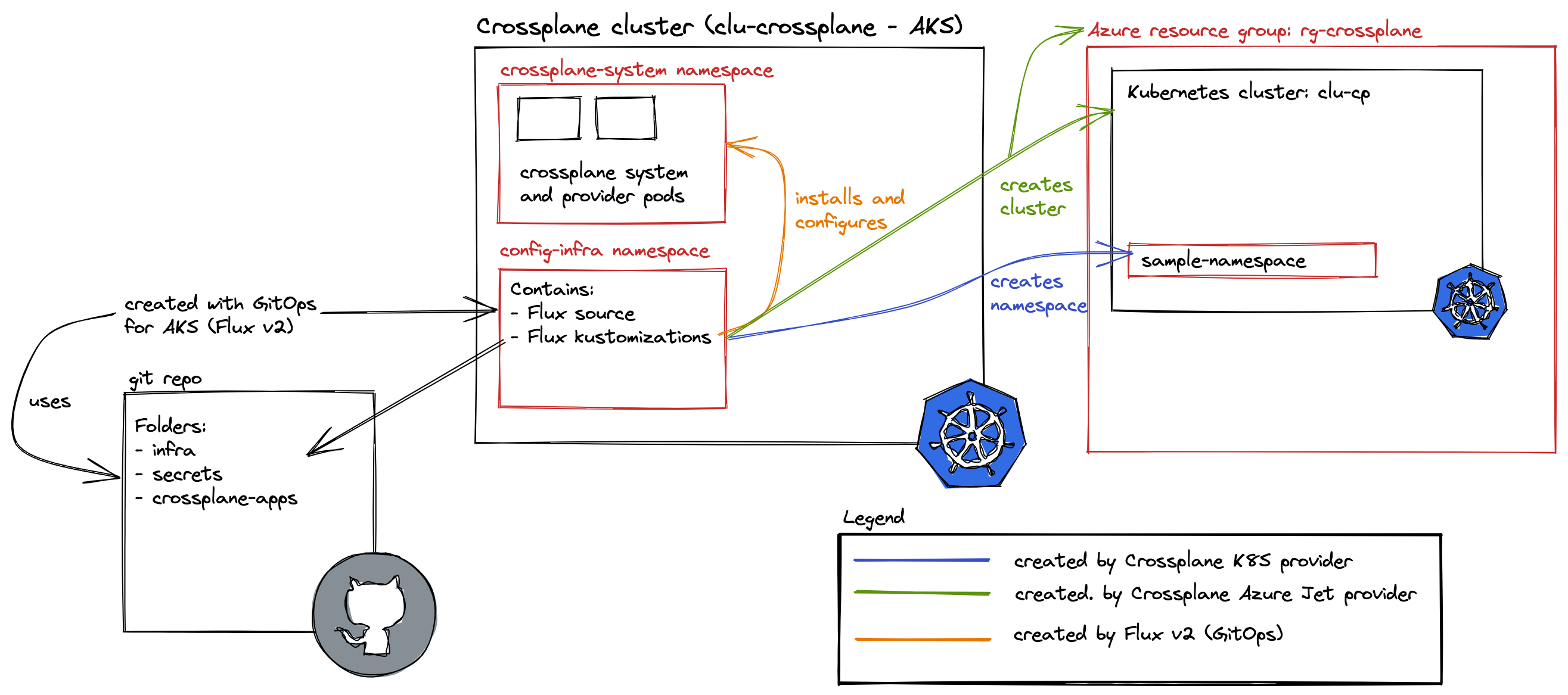- Installing Crossplane on a Kubernetes cluster (AKS); you can install on a local cluster as well (e.g., k3s, kind, minikube, …) but then you would need Azure Arc for Kubernetes to install the microsoft.flux extension (I will be using GitOps with Flux via that extension)