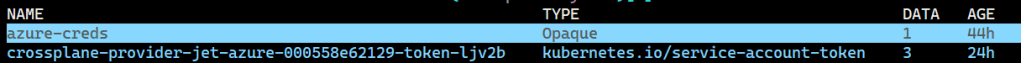 This creates a Kubernetes secret in the crossplane-system namespace with name azure-creds and a key creds that holds the credentials JSON.