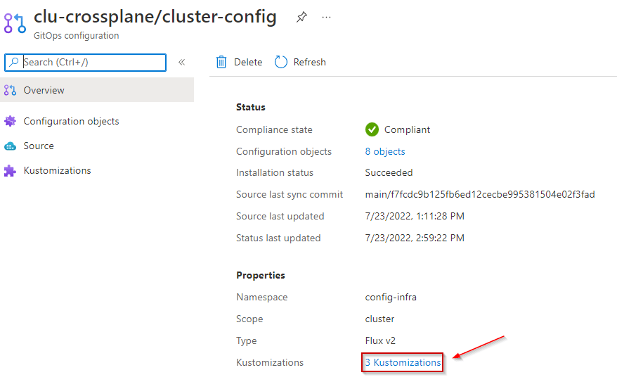 Note that the secrets kustomization is dependent on the infra kustomization. After running this command, ensure the secret is in the crossplane-system namespace. The k8s-configuration uses the same source but now has two kustomizations.