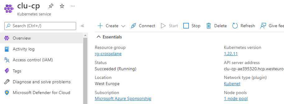 With that out of the way, we can create the resource group and AKS cluster. Earlier in this post, the YAML to create the resource group was already shown. To create a basic AKS cluster called clu-cp in this group, aks.yaml is used: