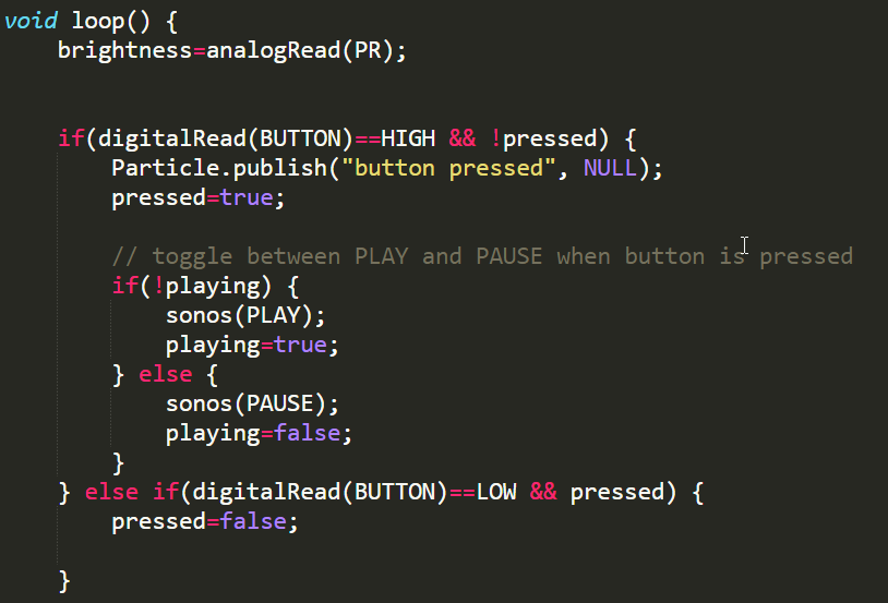 The above just sets the port and IP address for the request. We do this in the setup() function. When we press a button, we toggle between playing from a playlist or pausing the Sonos: