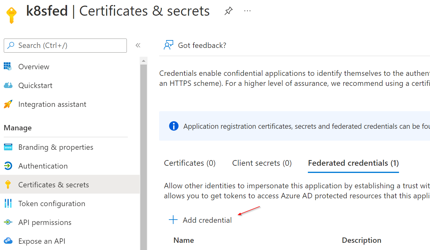 You find the above by clicking Certificates & Secrets and then Federated credentials.
