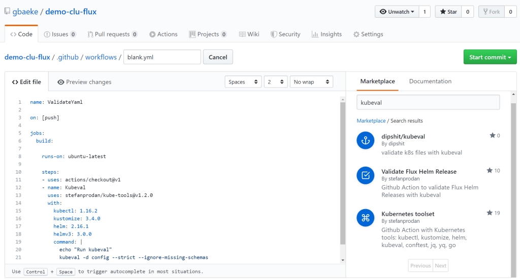 An action is defined in yaml 😉 and consists of jobs and steps, similarly to Azure DevOps and the likes. The action is run on Ubuntu (hosted by GitHub) and uses an action from the marketplace called Kubernetes toolset. You can easily search for actions in the editor: