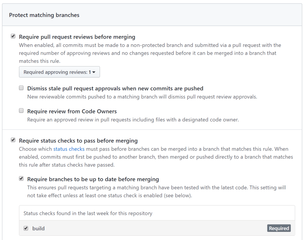 In the repository settings, I added a branch protection rule that requires a pull request review before merging plus a status check that must pass (the action):