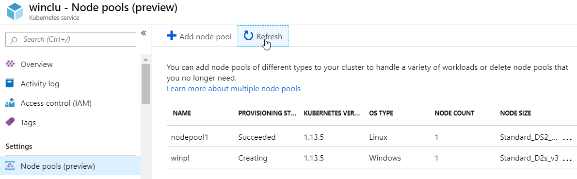 Note that you need to deploy a node pool with Linux first (as in the above command). That is why the number of nodes has been set to the minimum. You cannot delete this node pool after adding a Windows node pool.