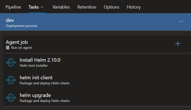The release pipeline simply uses the helm upgrade command via a Helm task provided by Azure DevOps: