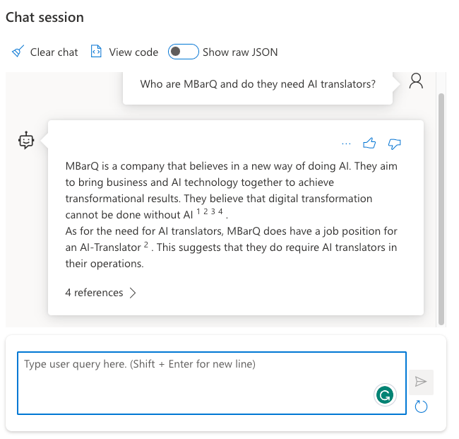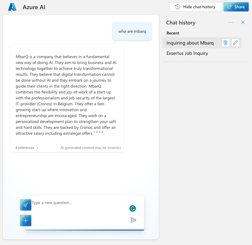 Note that whatever option you choose in the wizard, you will always end up with an index in Azure AI Search. When the index is created, you can start asking questions about your data: