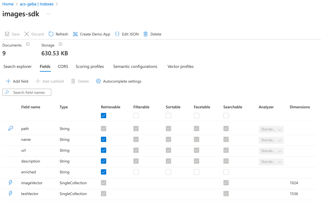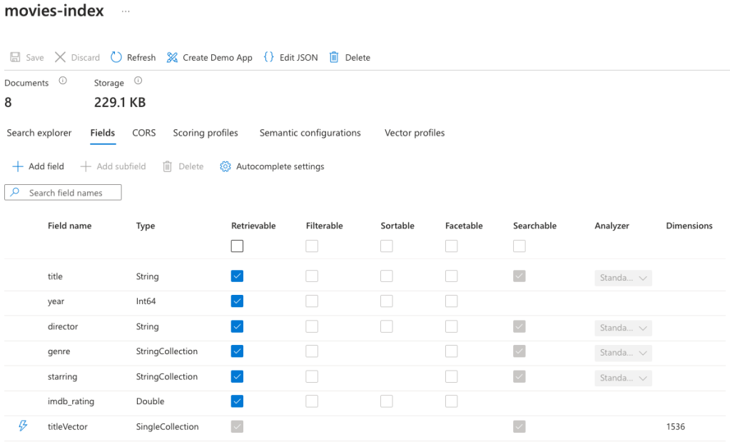 - add fieldsMapping to the Azure AI Search settings: contentFields and vectorFields are arrays; we need to map the fields in our index to the fields that the API expects